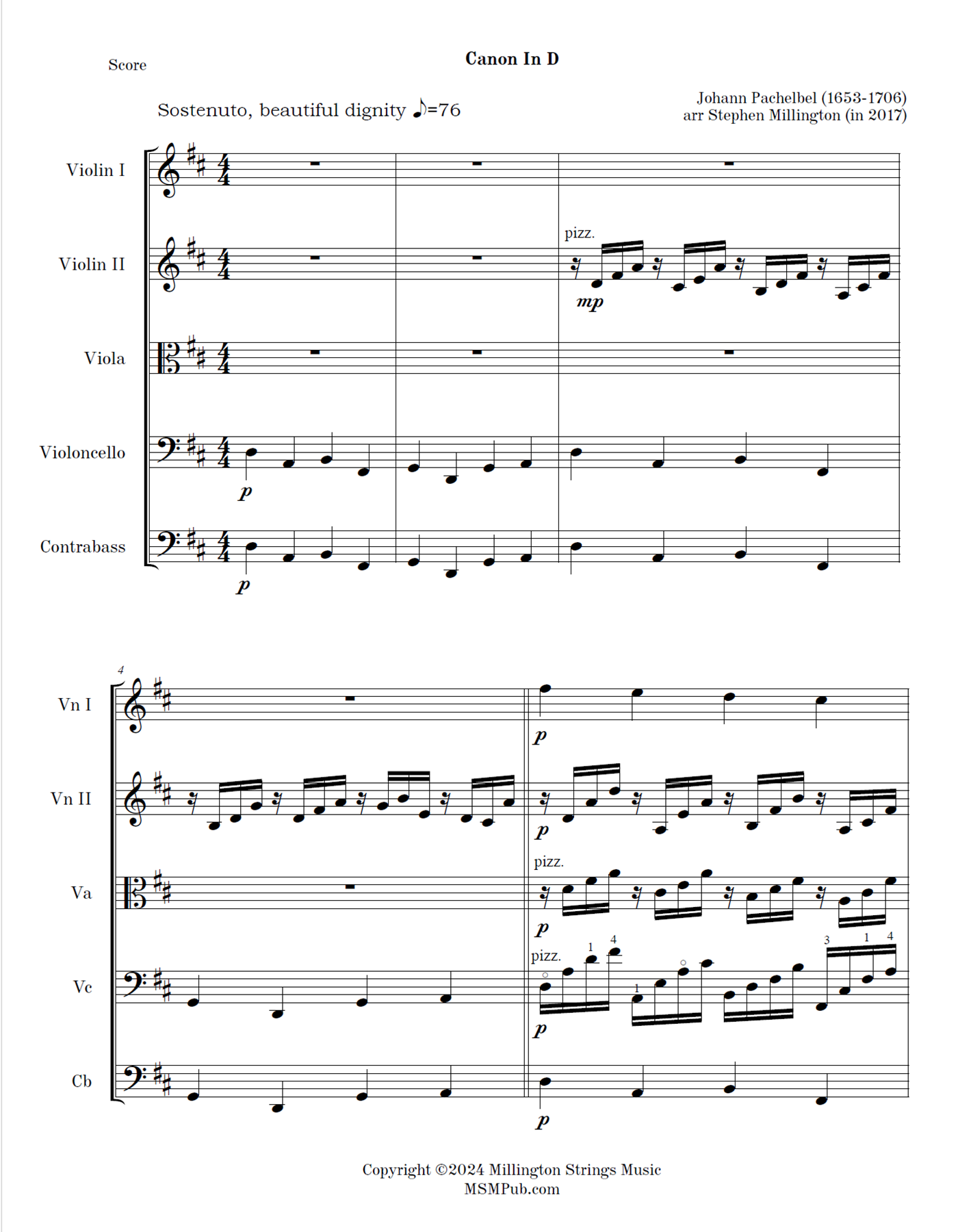 Pachelbel was known as an organ/keyboard composer, and was an important composer of church and chamber music. The story has it that this piece was composed for Johann Christoph Bach’s (JS Bach’s brother’s) wedding. A favorite for weddings since rediscovery in the 70’s, this version contains a nicely arpeggiated cello part, with the obligatory 8 note obligato in the bass.